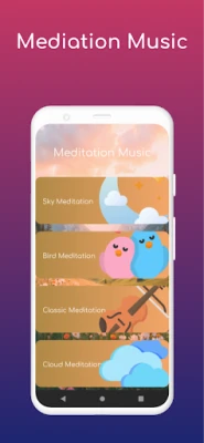 Meditation Music Library: Enjoy themed meditation tracks like Sky Meditation, Bird Meditation, Classic, and Cloud Meditation.